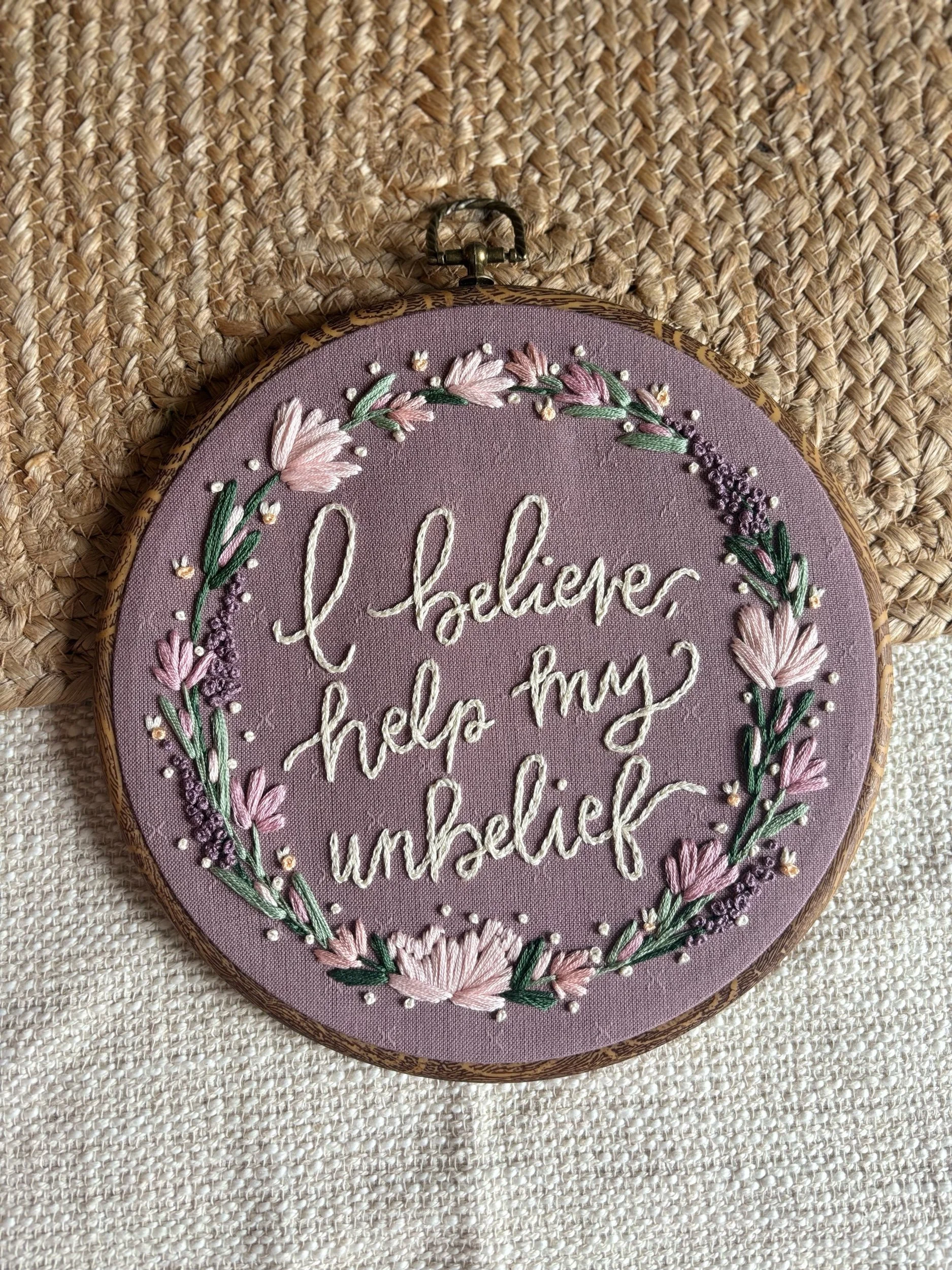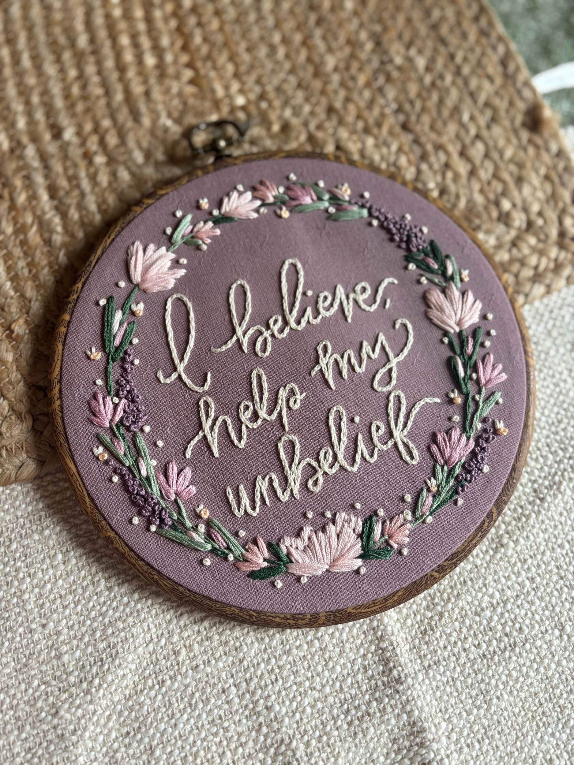 Thanks for stopping by Eunoria! I absolutely love embroidery and all my patterns are original designs that Iām so excited to make available to others who share the love of this art form! š This one declares the powerful words noted in Mark 9:24. A profound example of a prayer we can all continually say to our faithful Savior.